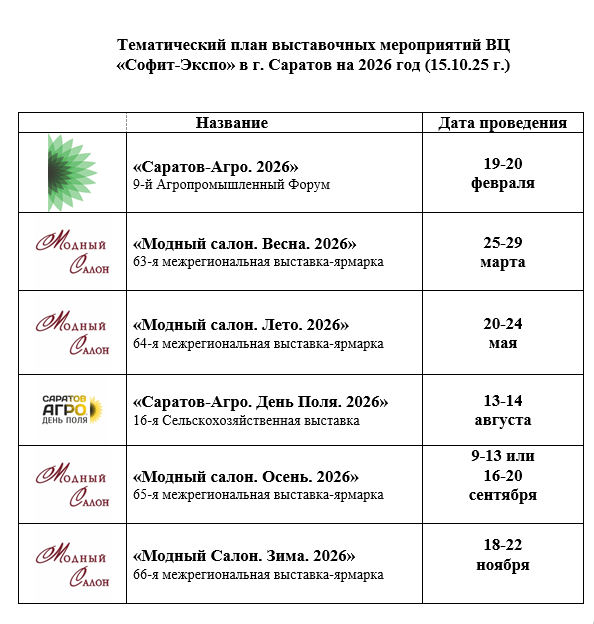 Обратите внимание, что дата проведения 65-й межрегиональной выставки-ярмарки "Модный салон. Осень. 2026" может измениться. В плане мероприятий она указана двумя возможными датами.